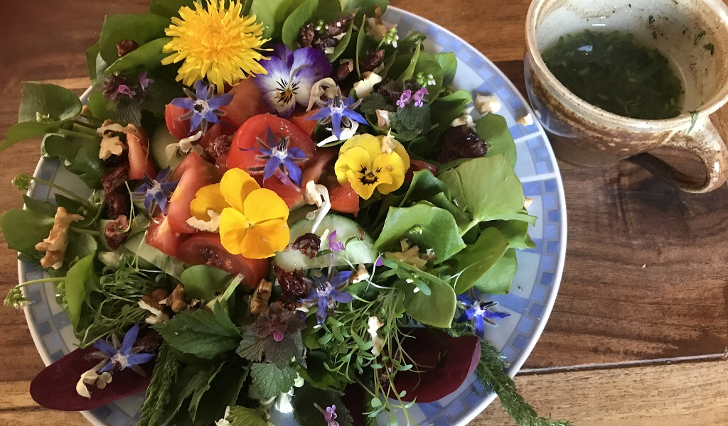 - saisonale Wildkräuter und essbare Blüten zum Dekorieren (auf dem Foto: Rote Melde, Giersch, Scharfgarbe, Borretschblüten, Taubnesselblüten, Hornveilchenblüten und Löwenzahnblüte)